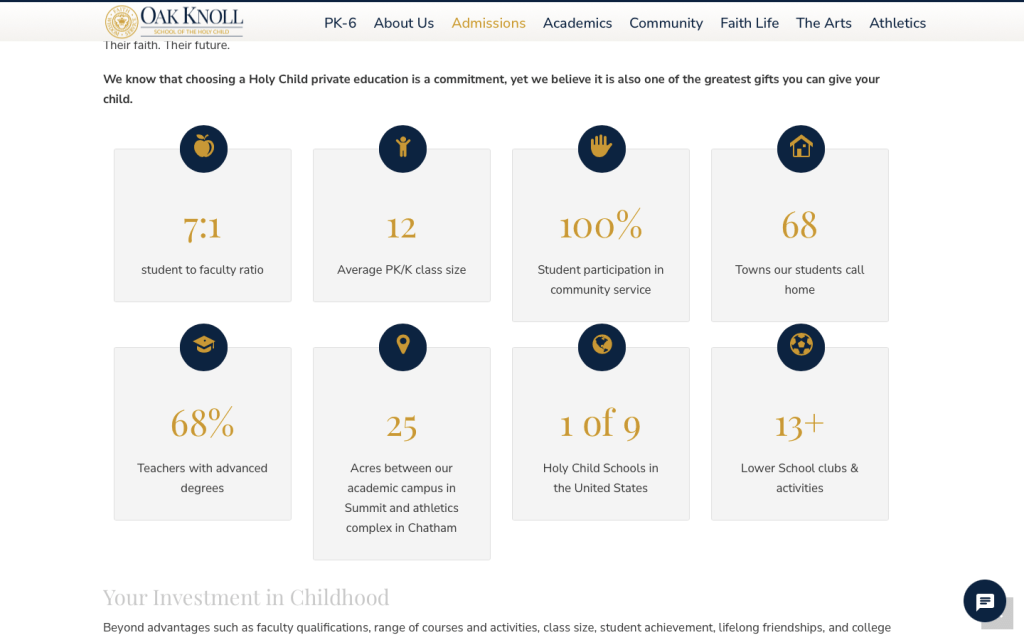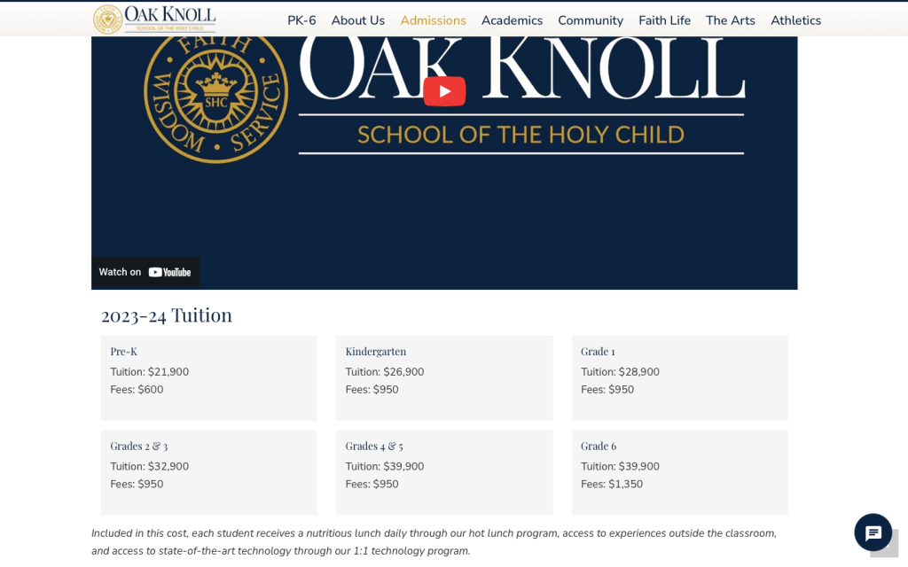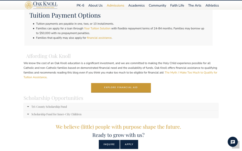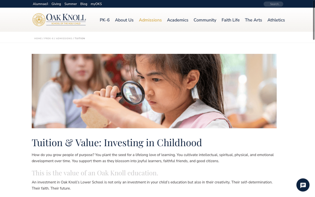 Trong ví dụ bên dưới, trang học phí của Oak Knoll School of the Holy Child đã thể hiện những điều trên. Thông tin về học phí vẫn còn đó, nhưng nó xuất hiện sau những tin nhắn củng cố giá trị trải nghiệm mà học sinh và gia đình có với trường. Một đoạn video ngắn với lời chứng thực của phụ huynh thậm chí còn thúc đẩy thông điệp sâu sắc hơn. Đồng thời đề xuất những phương án Hỗ trợ học phí (financial aid) để PHHS tiếp tục có động lực và hi vọng. Đối với mình, đây là một trang thông tin học phí xuất sắc và đầy cảm xúc.
