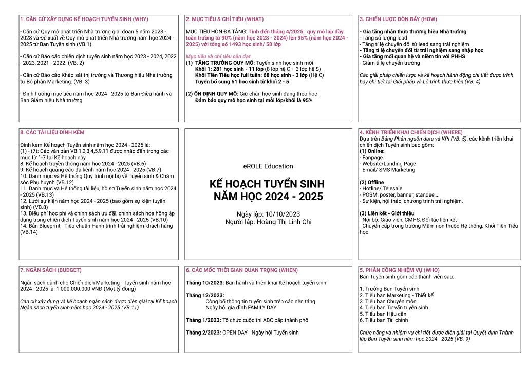 – Một số nội dung chưa được thể hiện: phân công Ban Tuyển sinh, kênh tiếp cận, ngân sách.