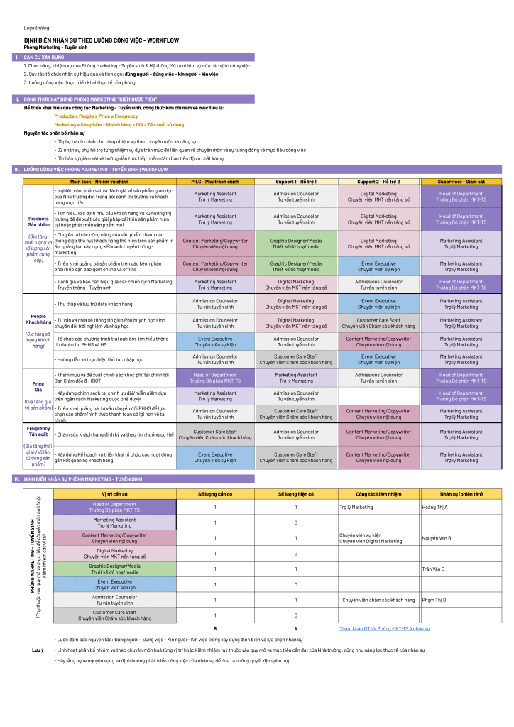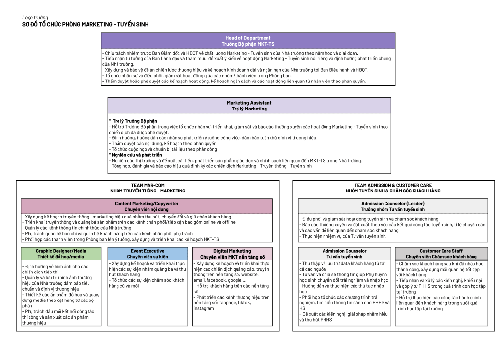 - Hoạch định mảng việc chính của từng cá nhân và nhóm chuyên môn tương đồng: Quản lý chung – MKT và Truyền thông – Tuyển sinh và Chăm sóc khách hàng