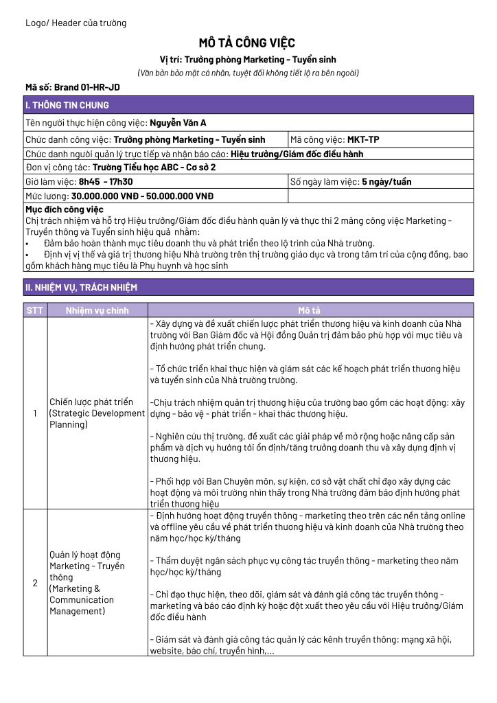 Để nhận toàn bộ file 4 bản Mô tả vị trí công việc, các Thầy cô vui lòng để lại email: