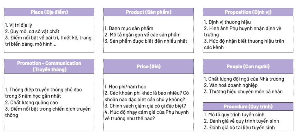 Mô hình Phân tích đối thủ cạnh tranh 7Ps tìm hiểu đối thủ dựa trên 7 yếu tố ảnh hưởng trực tiếp tới Marketing – Tuyển sinh là: