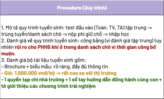 Ở ví dụ trên, chúng ta nhận thấy rằng, có 3 điểm đáng chú ý trong quy trình tuyển sinh của *school. Trong đó, thông tin màu đỏ là điểm bạn đánh giá tạo cảm giác rủi ro cao cho PHHS, thông tin màu xanh là điểm sáng trong cách nhà trường truyền thông điệp, giá trị gia tăng bằng Bộ tài liệu tuyển sinh; còn thông tin màu vàng là thông tin chưa rõ là lợi hay hại, có nên học tập hay không?